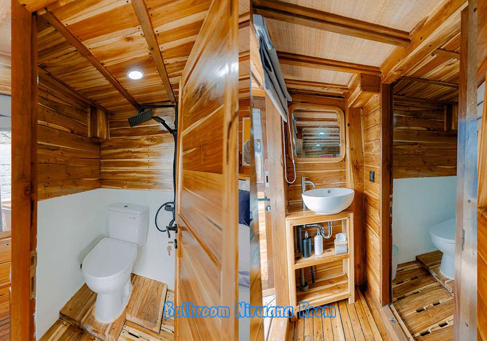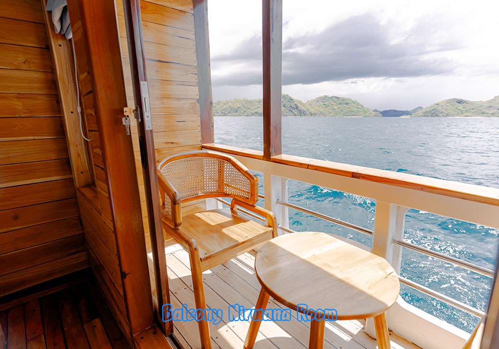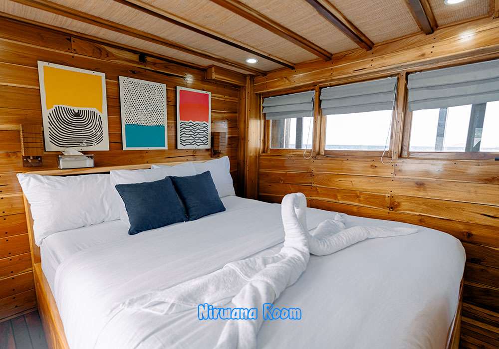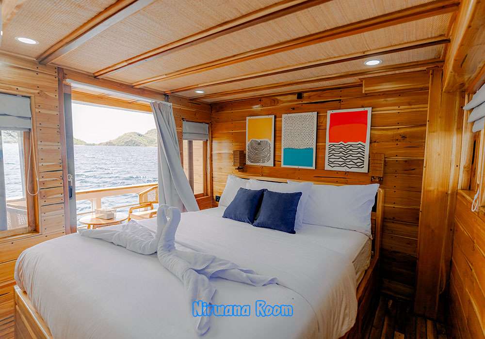 • Nirwana Room is located on the main deck. This room has a queen size bedroom with an ocean view, a private balcony, ensuite private bathroom with hot water, and air conditioning. The room has a capacity of 2 people.