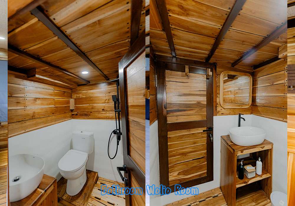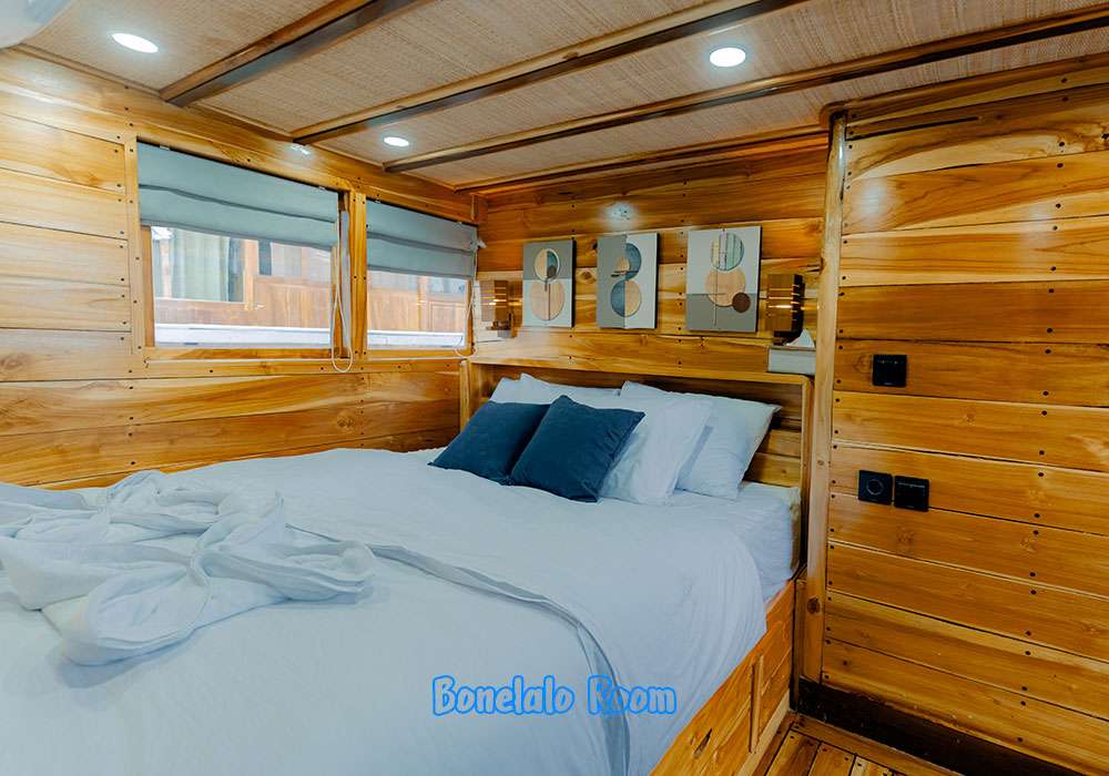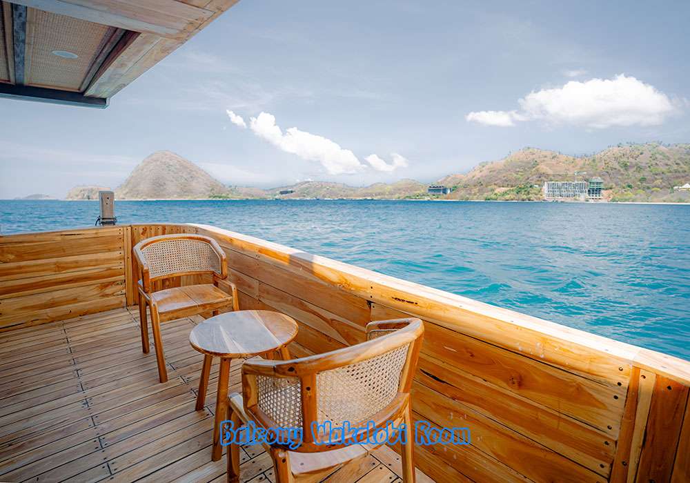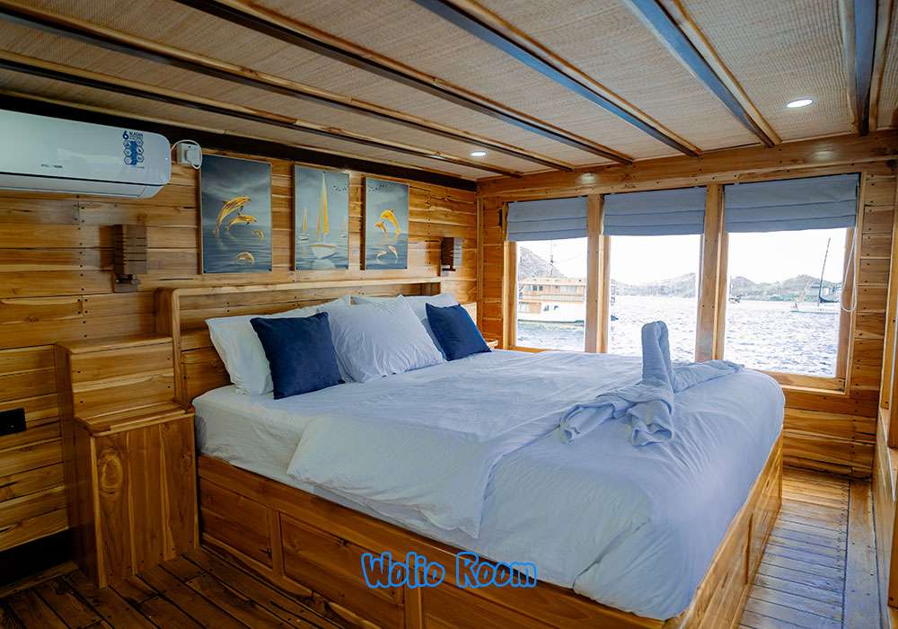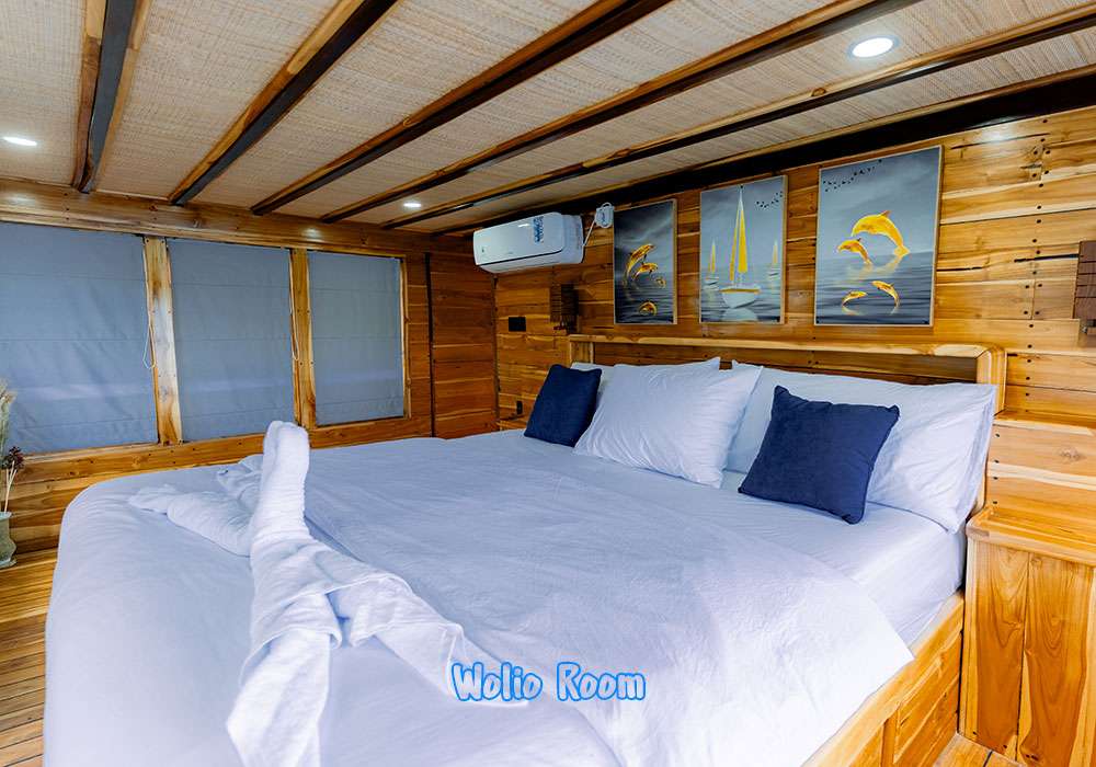 • Wolio Room is collated on the upper deck. The room has a queen-sized bed with a full ocean view, a private balcony, and a private ensuite bathroom with hot water, and air conditioning. It has a capacity of 2 people.