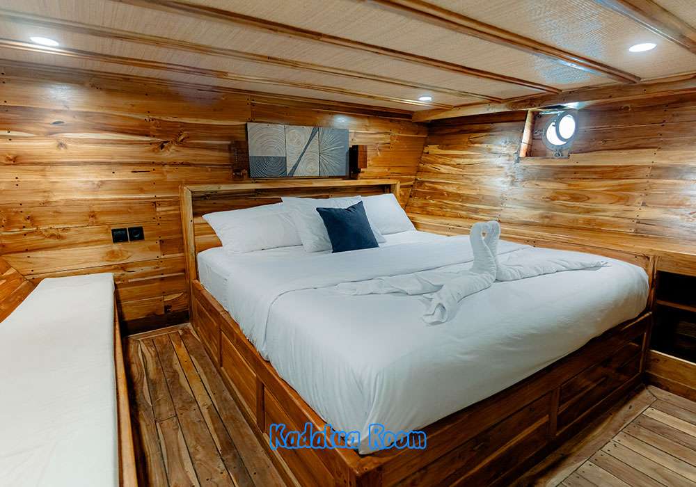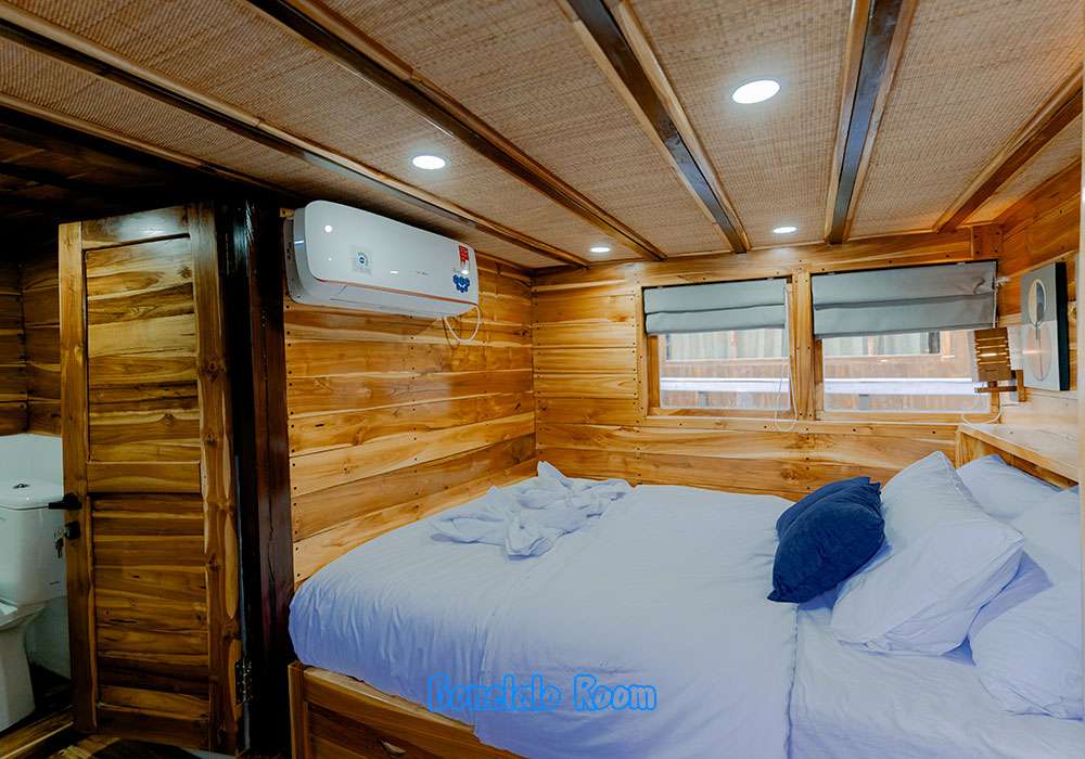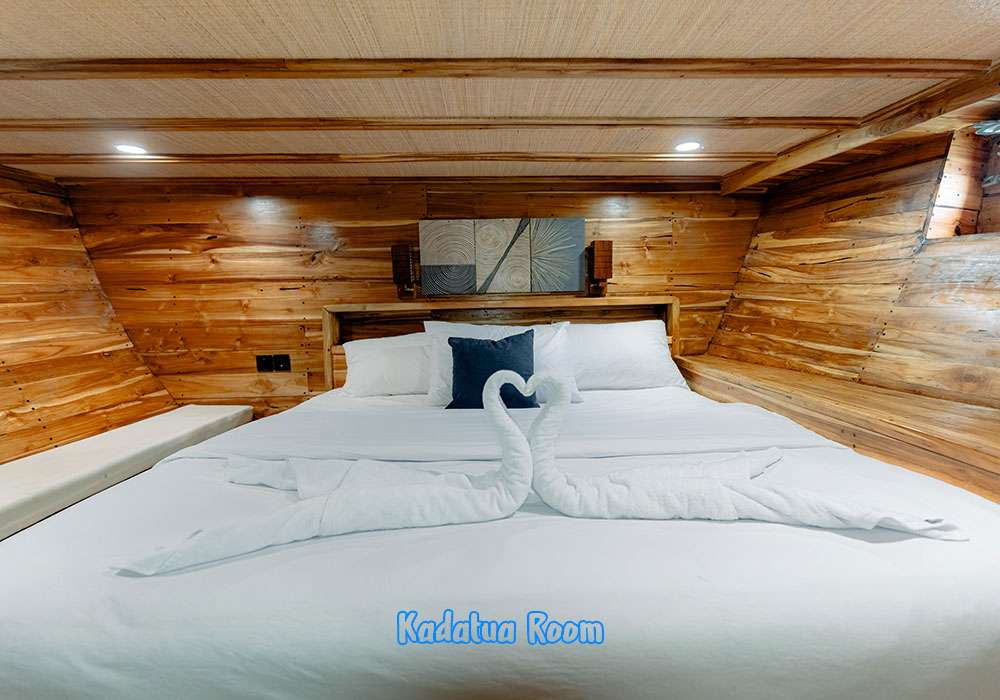 • Kadatua Room is located on the lower deck. The room has a queen bed with a lounge chair, air conditioning, and a private bathroom. This room has a capacity of 2 people.