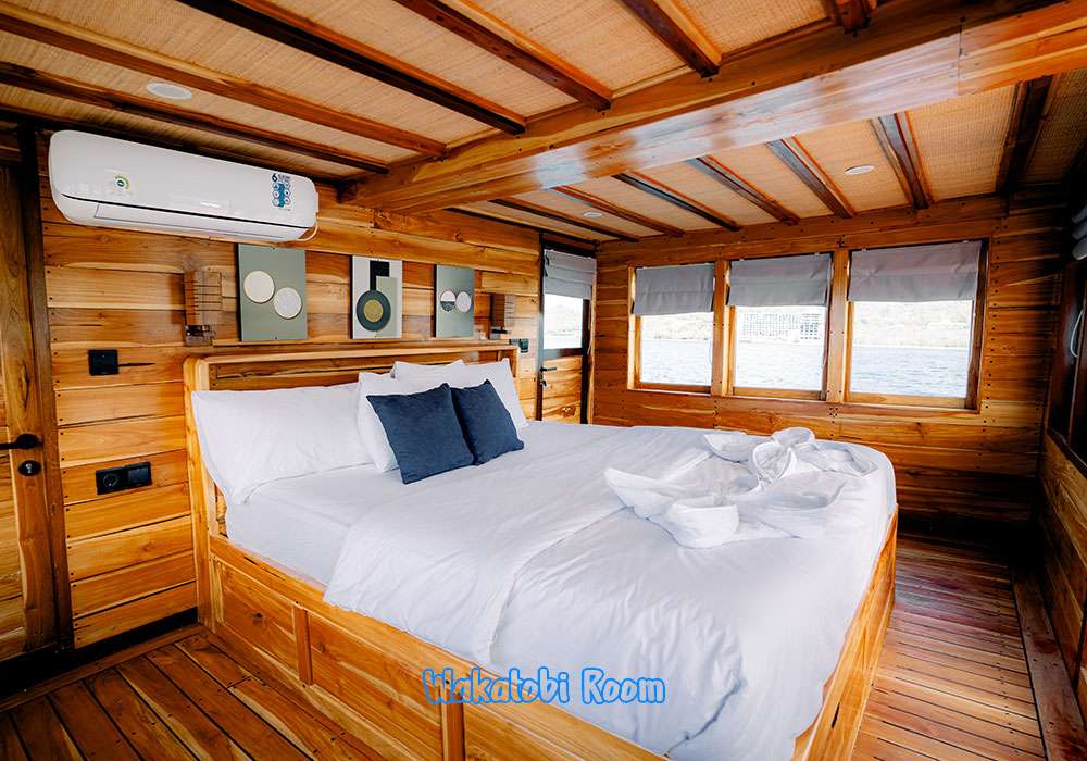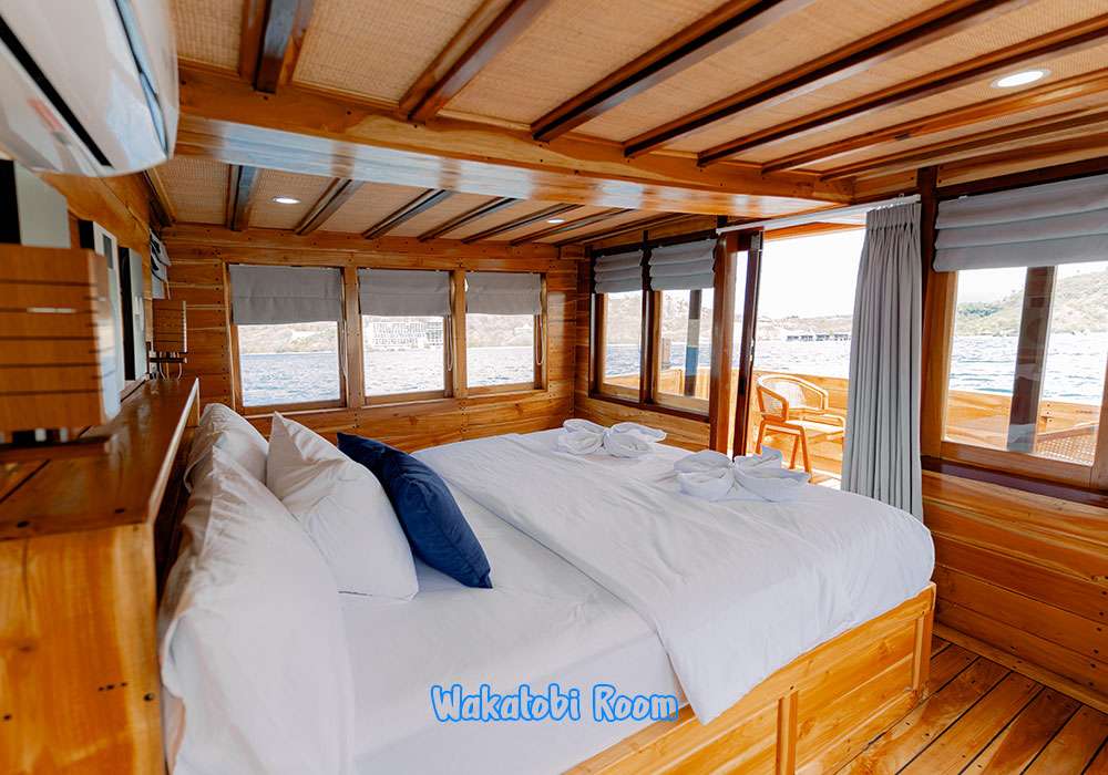 • Wakatobi Room is located on the main deck. This room has a queen-sized bed with an ocean view, air conditioning, an ensuite private bathroom with hot water, and a private balcony. It is fit for two people.